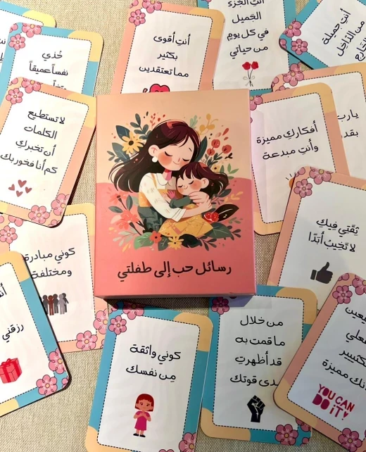 صندوق رسائل حب إلى طفلتي: ٣٠ بطاقة تشجيعية ملونة كتبتها أمهات خبيرات! ضعيها في علبة غدائه أو غرفته يومياً لتعزيز ثقته وتذكيره بأنه مميز. بطاقات مقاومة للماء بمساحة لاسم طفلك – صنع في الأردن. هدية عاطفية تزرع الأمان وتخلق طقوساً يومية لا تُنسى.